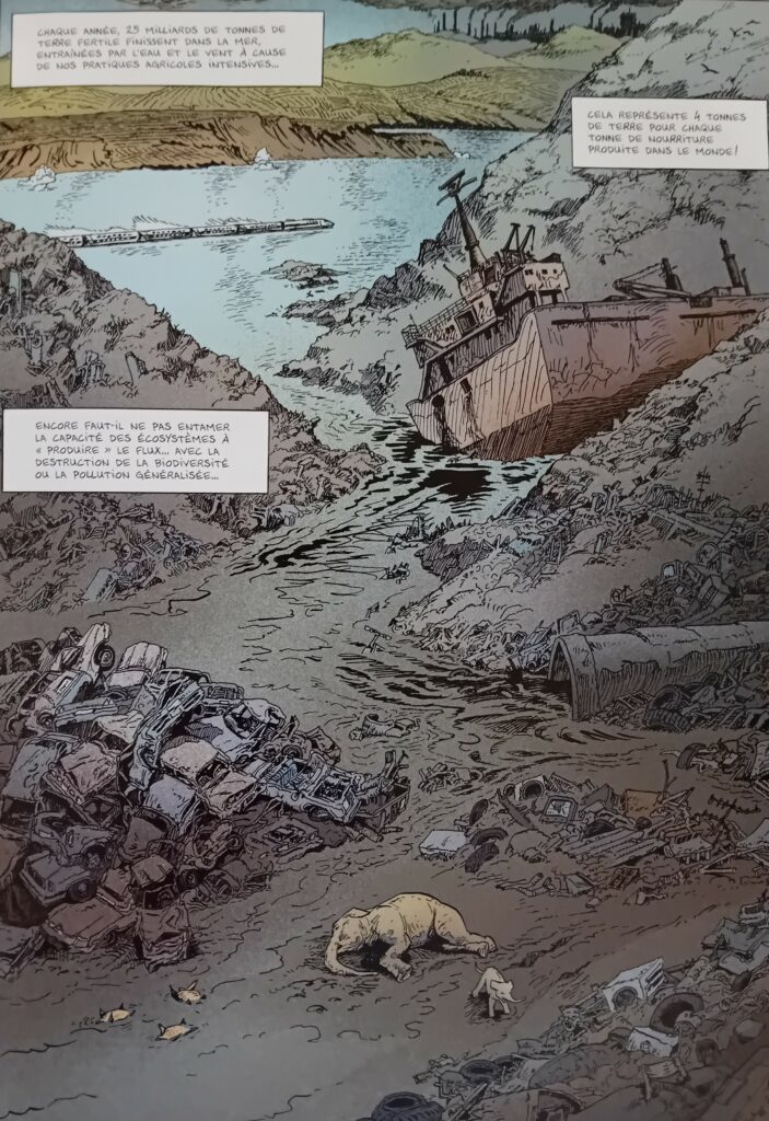 [3] On pourra cependant regretter, pour les plus radicaux d’entre nous, la quasi-absence de critique du capitalisme en tant que tel, car c’est bien lui, et les capitalistes qui lui donnent corps, en dernière instance, le responsable. Cela dit, dans une BD grand public et accessible à tous, on comprend que cette critique reste sous-jacente, et cela ne retire rien à la grande qualité du livre.
