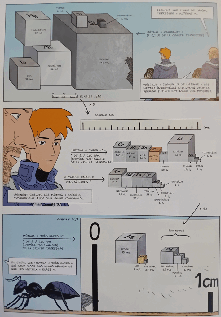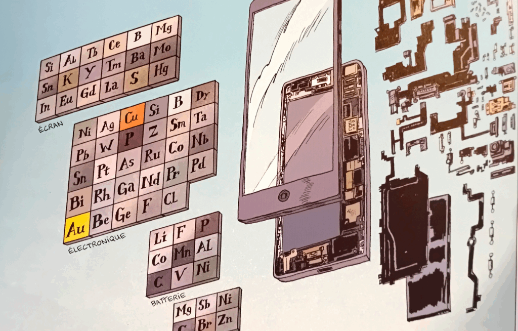 Pourquoi une bande dessinée pour traiter d’un sujet aussi technique, aussi complexe et en même temps aussi méconnu et refoulé voire rejeté ? Précisément, parce que c’est un sujet technique, complexe, méconnu, refoulé et rejeté. Le dessin permet de montrer ce que l’on ne veut pas voir, d’expliquer ce que de longues phrases peinent à exprimer, de faire sentir des réalités impalpables, de voyager plus vite que la lumière dans le temps et l’espace. Et cela, l’auteur de bandes dessinées Vincent Perriot ne s’en prive pas. Entreprenant avec l’ingénieur et auteur Philippe Bihouix, engagé depuis plusieurs années dans la vulgarisation des enjeux techniques et la critique d’un certain productivisme, un dialogue illustré autour de la thématique des ressources et de leur rôle central dans la civilisation techno-capitaliste ainsi que dans la catastrophe écologique, Vincent Perriot met le dessin au service du discours critique, tout comme il met le discours critique au service du dessin. L’un et l’autre sont dès lors indissociables et se nourrissent, ce qui fait la force incroyable de la BD. Il ne s’agit pas « d’illustrer » simplement les thèses de Bihouix, mais de les féconder par le dessin qui devient lui-même vecteur d’idée tandis que le discours rationnel devient par moment source de poésie. En d’autres termes, la beauté du dessin est la meilleure façon d’ouvrir l’esprit du lecteur – jugez-en plutôt.