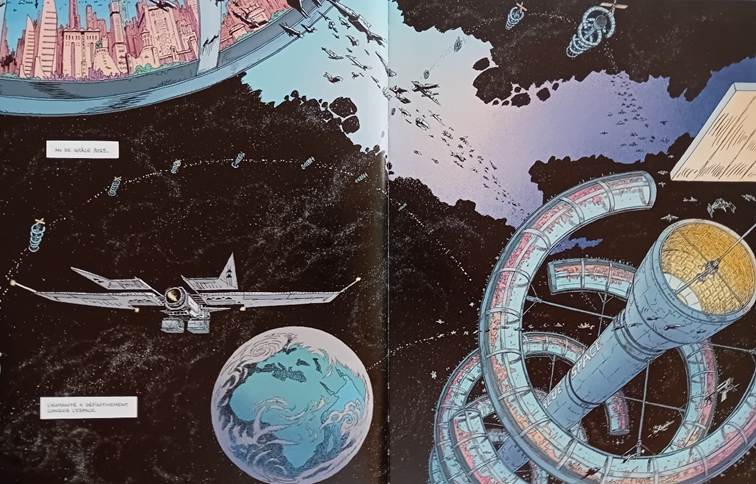 La BD prend la forme, donc, d’un dialogue entre les deux protagonistes : à l’émerveillement – presque la naïveté, au bon sens du terme – du dessinateur, répond la lucidité et la rationalité de l’ingénieur. Ce dialogue se poursuit de monde en monde, d’époque en époque, de rêve en réalité et de science en fiction. Ressources est un véritable voyage, je l’ai dit, donnant presque le tournis, tant on sent que le dessinateur se fait plaisir – et nous avec – en transportant son lecteur du désert moderne à la jungle préhistorique, du vide intersidéral de l’espace à l’enfer des mines de métaux, du Mont Olympe à une Paris ensevelie de déchets, d’une cathédrale en construction à l’envol d’une fusée, d’un sous-bois nocturne au cockpit d’un vaisseau spatial, de l’Angleterre victorienne de Marie Shelley à l’explosion provoquée par une rencontre matière-antimatière… Une épopée au cœur des ressources matérielles qui ont fait la « civilisation » et des conditions de leur extraction et de leur utilisation. Mais aussi un pèlerinage à la rencontre de grandes figures (intellectuels, artistes, scientifiques, économistes, entrepreneurs…) comme Platon ou Descartes, mais aussi Thomas More et Francis Bacon, Ivan Illitch et Jacques Ellul, Stanley Jevons et William Nordhaus ou encore Pier Paolo Pasolini…